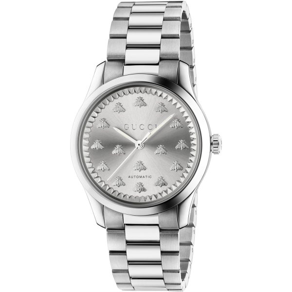 L’orologio Gucci G-Timeless con motivo ape, referenza YA1264190, incarna l’eleganza e lo stile distintivo del marchio. Dotato di un movimento automatico di precisione, questo orologio da uomo vanta una cassa in acciaio da 38 mm e un quadrante argentato con dettagli di api sottilmente incisi. Il bracciale in acciaio riflette la qualità artigianale del design Gucci, mentre la chiusura Déployante garantisce comfort e sicurezza. Resistente all’acqua fino a 50 metri, questo orologio unisce funzionalità e raffinatezza in un’unica creazione senza tempo. Un’ottima scelta per chi cerca un accessorio di lusso che esprima classe e personalità senza tempo.