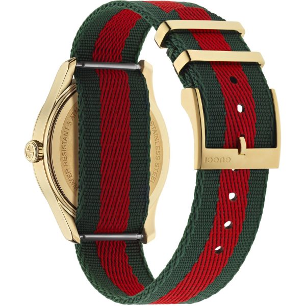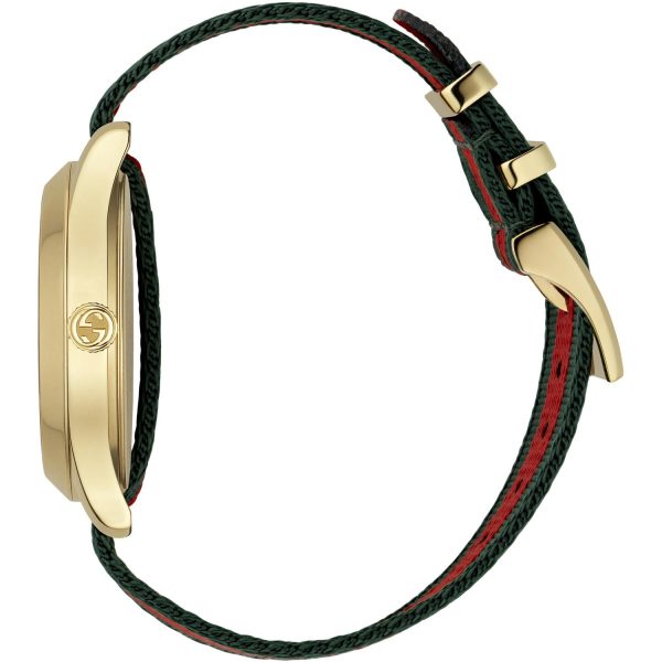Imponente e sofisticato, l’orologio da uomo Gucci YA126487B della collezione G-Timeless incarna l’eleganza senza tempo del marchio italiano. Il case in PVD giallo è abbinato a un quadrante verde-rosso-verde in nylon con ricamato un’ape dorata, simbolo distintivo di Gucci. Il cinturino in nylon a bande verde-rosso-verde completa l’ensemble, conferendo un tocco di modernità e originalità al design classico. Con carica al quarzo, resistenza all’acqua fino a 5 ATM e vetro zaffiro, questo orologio incarna l’eccellenza artigianale e la precisione che contraddistinguono Gucci. Un accessorio distintivo che unisce tradizione e innovazione per l’uomo contemporaneo che ricerca l’eccellenza in ogni dettaglio.