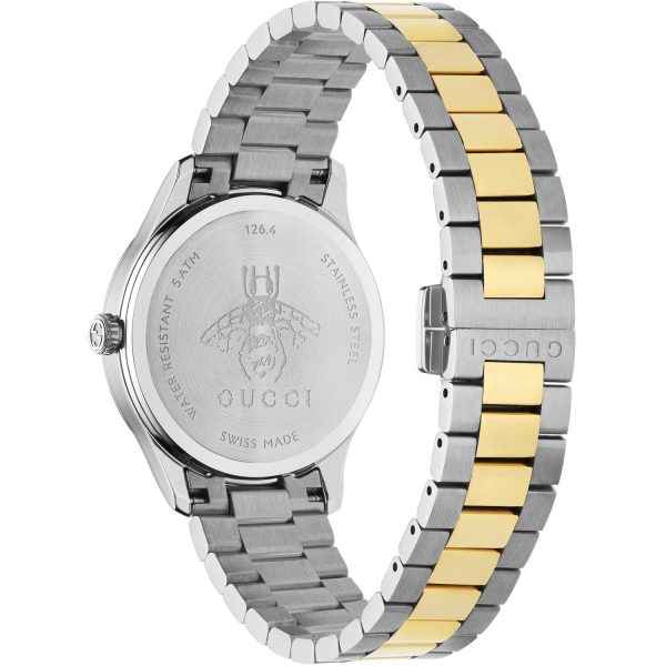 L’orologio da donna Gucci G-Timeless con motivo ape è un’elegante creazione che incarna l’eccellenza del brand. Il quadrante in malachite verde è impreziosito da api placcate in oro giallo che conferiscono un tocco di unicità e raffinatezza al design. La cassa da 32 mm in acciaio si sposa armoniosamente con il bracciale in acciaio e oro, garantendo un look sofisticato e distintivo. Dotato di movimento al quarzo, resistente all’acqua fino a 50 metri e con vetro zaffiro, questo orologio rappresenta un connubio perfetto tra stile e funzionalità. Un accessorio prezioso e di classe che valorizzerà ogni outfit femminile con eleganza e personalità.