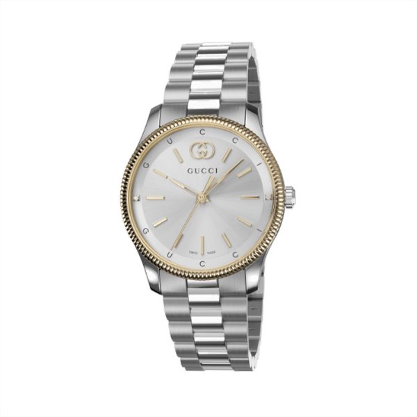 L’eleganza senza tempo di Gucci si manifesta nell’orologio G-Timeless, referenza YA1265063, pensato per le donne che apprezzano il lusso discreto e raffinato. Con una cassa in acciaio da 29 mm e lunetta placcata in oro, questo orologio si distingue per il quadrante argento impreziosito da due diamanti e il logo Gucci inciso. Il bracciale in acciaio è un connubio perfetto di robustezza e stile, mentre la chiusura déployante garantisce una vestibilità comoda e sicura. Resistente fino a 5 atmosfere, questo modello è dotato di movimento al quarzo di precisione, ideale per chi ricerca un accessorio di classe per ogni occasione. Con materiali pregiati e dettagli curati, l’YA1265063 incarna la maestria artigianale e il design distintivo che contraddistinguono il marchio Gucci nel panorama degli orologi di lusso.