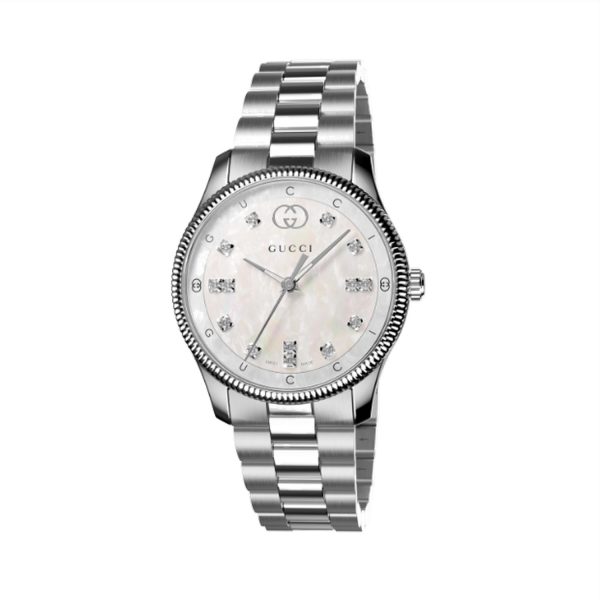 L’orologio da donna Gucci G-Timeless 29 mm unisce eleganza e raffinatezza in un design senza tempo. La cassa in acciaio inossidabile incornicia un delicato quadrante in madreperla impreziosito da indici in diamanti e il logo Gucci distintivo. Il bracciale in acciaio si integra armoniosamente con la cassa, conferendo un tocco di modernità e stile. Dotato di movimento al quarzo di precisione, resistente all’acqua fino a 5 ATM e vetro zaffiro antigraffio, questo orologio incarna la maestria artigianale e l’eleganza senza tempo del marchio Gucci. Un’aggiunta sofisticata e di classe per qualsiasi collezione di orologi di lusso.