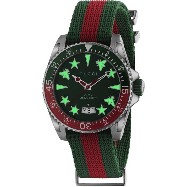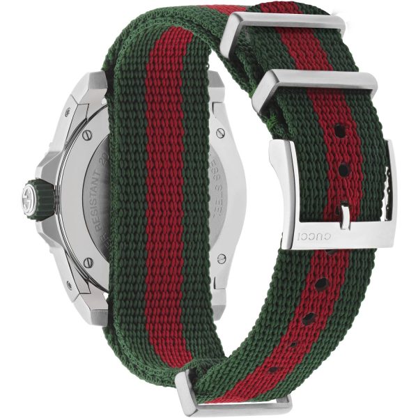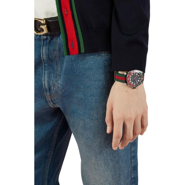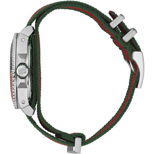 Gucci – YA136339 – Gucci Dive Steel case, green and red bezel, green rubber crown, green dial with multi icon indexes, recycled polyester web strap