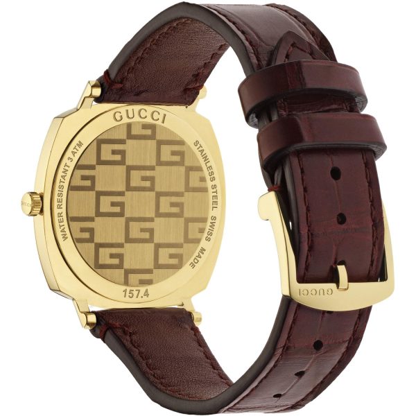 L’orologio da uomo GUCCI YA157402 della collezione Grip incarna l’eleganza e lo stile distintivo del marchio italiano. Il suo design raffinato e contemporaneo si esprime attraverso una cassa in acciaio rivestita in PVD oro giallo, impreziosita da tre finestre che indicano l’ora, i minuti e la data. Il quadrante dorato e il cinturino in pelle di alligatore bordeaux conferiscono un tocco di classe e originalitร a questo accessorio di alta gamma. Resistente all’acqua fino a 3 ATM, dotato di vetro zaffiro e chiusura ad ardiglione in acciaio, questo orologio rappresenta una scelta sofisticata per l’uomo moderno che ricerca l’eccellenza e l’esclusivitร in ogni dettaglio.