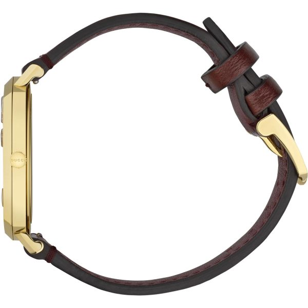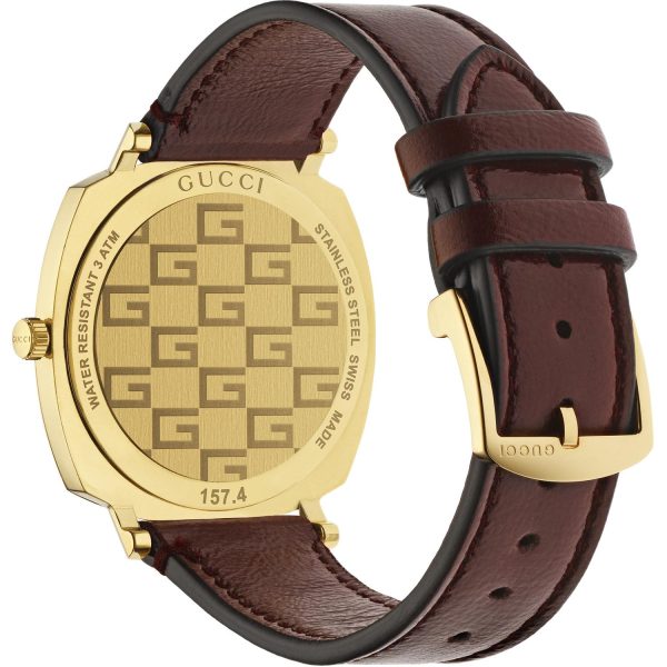 L’eleganza intramontabile del design Gucci si fonde con la tecnologia di precisione in questo orologio da uomo YA157411 della collezione Grip. La cassa in acciaio PVD oro giallo, dal diametro di 38mm, incornicia un quadrante color oro impreziosito da tre finestre che indicano le ore, i minuti e la data. Il cinturino in pelle bordeaux aggiunge un tocco di raffinatezza, mentre la chiusura a ardiglione in acciaio assicura una perfetta vestibilitร al polso. Resistente all’acqua fino a 3 ATM, questo orologio รจ un connubio di stile e funzionalitร che esprime al meglio l’anima distintiva del marchio Gucci. Un accessorio di prestigio, destinato a lasciare il segno in ogni occasione.