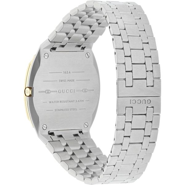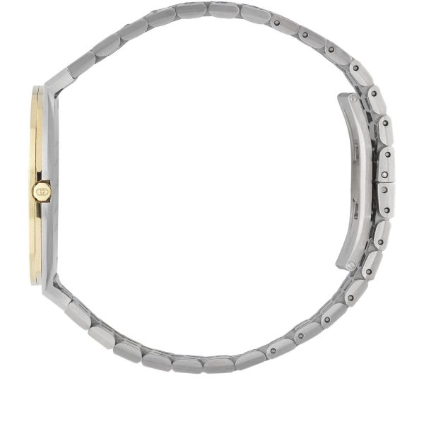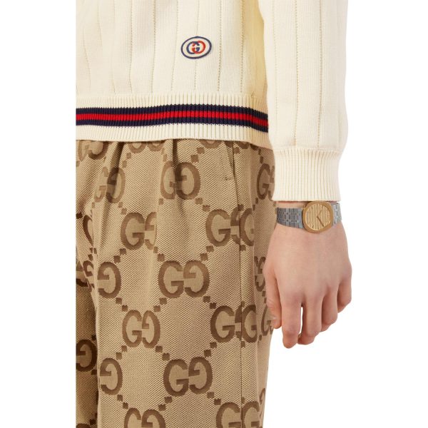 L’orologio da uomo GUCCI YA163405 incarna l’eleganza senza tempo del marchio, con una cassa multistrato in acciaio inossidabile e placcata in oro giallo 18 kt che cattura lo sguardo con raffinatezza. Il quadrante dorato in ottone presenta il caratteristico motivo GG di Gucci, mentre il bracciale a cinque maglie in acciaio inossidabile conferisce al design un tocco di modernità e resistenza. Con un diametro di 38 mm, questo orologio al quarzo unisce stile e funzionalità, garantendo prestazioni di alta precisione. Resistente all’acqua fino a 30 metri e dotato di vetro zaffiro antigraffio, questo modello si distingue per la sua qualità artigianale e dettagli curati. Un accessorio di classe per l’uomo contemporaneo che apprezza il lusso discreto e la raffinatezza senza tempo.