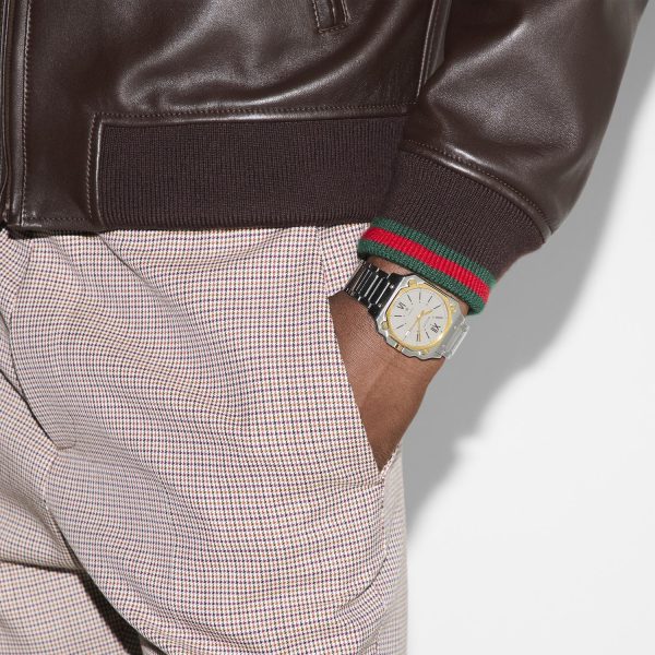 Gucci – YA166403 – G-Flat 36mm stainless steel case; Silver opaline dial with 18kt gold plating, date at 3 o’clock; Stainless steel bracelet