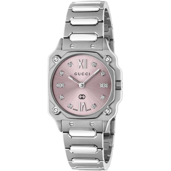 Elegante e sofisticato, l’orologio da uomo GUCCI YA166501 incarna l’eccellenza dell’artigianato e del design italiani. Il robusto case da 24 mm in acciaio inossidabile accoglie un delicato quadrante rosa galvanizzato impreziosito da indici romani alle ore 12 e 6 e da 12 scintillanti diamanti. Il bracciale in acciaio completa l’estetica raffinata di questo orologio, che unisce un movimento al quarzo di precisione a una resistenza all’acqua fino a 5 ATM. Il vetro zaffiro protegge con eleganza il quadrante, mentre il numero di riferimento YA166501 conferma l’autenticità e l’esclusività di questo capolavoro di alta orologeria firmato Gucci. Un’icona di stile e prestigio destinata a distinguersi in ogni occasione.