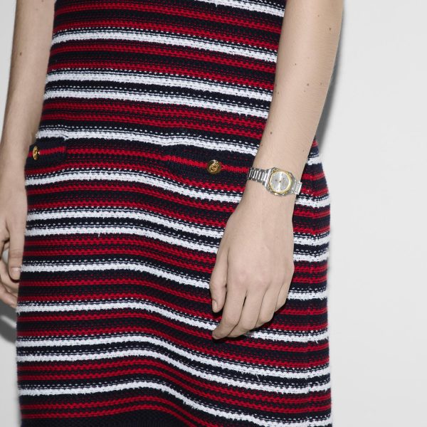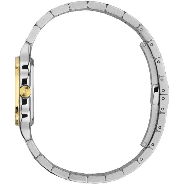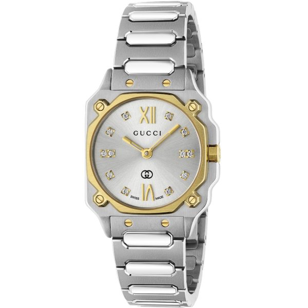 Il raffinato orologio da donna Gucci YA166503 incarna l’eleganza e lo stile distintivo del marchio. Caratterizzato da un diametro di 24 mm, il cassa in acciaio inossidabile con lunetta e viti placcate in oro giallo 18kt cattura l’attenzione con il suo design sofisticato. Il quadrante argentato galvanizzato è impreziosito da indici romani alle ore 12 e 6, mentre dodici diamanti brillano con discrezione. Il movimento al quarzo garantisce precisione e affidabilità, mentre il vetro zaffiro protegge questo capolavoro con stile. Completa il look la resistente e raffinata bracciale in acciaio inossidabile, conferendo un tocco di classe e modernità. Un’opera d’arte per chi cerca un orologio di lusso senza tempo.