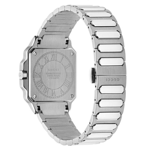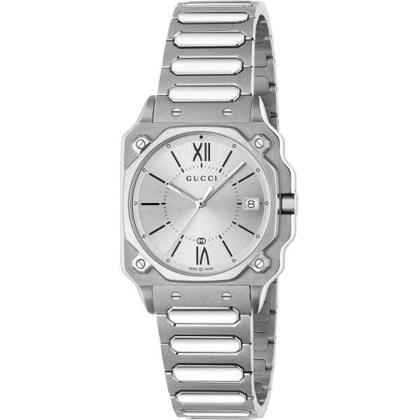 L’orologio da donna Gucci YA166504 della collezione G-Flat rappresenta l’eccellenza artigianale e il design distintivo del marchio. Il quadrante argentato, arricchito da indici romani alle 12 e alle 6 e datario alle 3, si inserisce armoniosamente in una cassa in acciaio inossidabile da 30mm. Il bracciale in acciaio completa l’estetica raffinata e contemporanea di questo modello, che si distingue per la precisione del movimento al quarzo. Resistente fino a 5 ATM, questo orologio unisce stile e funzionalità con materiali di alta qualità, come il vetro zaffiro. Un’opzione sofisticata per la donna che ricerca un accessorio di classe per ogni occasione.