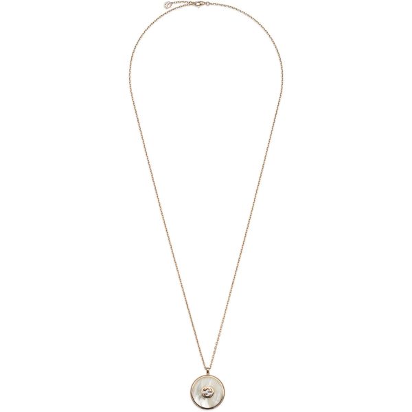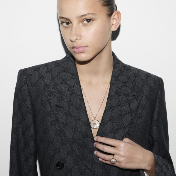 Elevato simbolismo e sofisticazione trapelano dalla Collana Gucci Interlocking in oro rosa, madreperla e diamanti GG pavé, referenziata con il codice YBB786777001. Un’opera d’arte che incarna l’eleganza intramontabile del marchio Gucci, combinando materiali pregiati e design distintivo. Il ciondolo a forma di cabochon rotondo cattura lo sguardo con la sua lucentezza, mentre la lavorazione artigianale di altissimo livello conferisce un tocco di raffinatezza senza tempo. Un’iconica creazione che esprime al meglio l’estetica unica e l’eccellenza artigianale che contraddistinguono Gucci nel mondo dei gioielli di lusso.