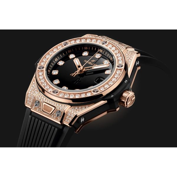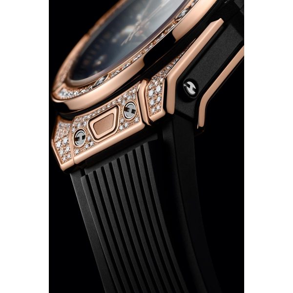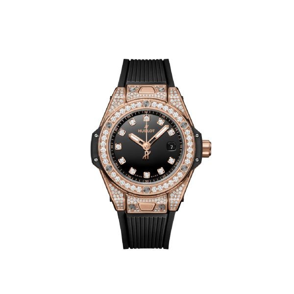 L’orologio da uomo HUBLOT 485.OX.1280.RX.1604 della collezione BIG BANG ONE CLICK KING GOLD PAVÉ incarna l’eccellenza artigianale e l’estetica raffinata del marchio svizzero. Dotato di un movimento automatico di precisione, presenta un quadrante nero impreziosito da 11 diamanti che conferiscono un’eleganza unica. La cassa in oro si sposa armoniosamente con il cinturino in caucciù nero, garantendo un comfort superiore. La lunetta in oro è impreziosita da 166 diamanti, mentre la chiusura deployant in oro e titanio assicura una perfetta aderenza al polso. Resistente all’acqua fino a 10 ATM, questo orologio rappresenta un connubio perfetto tra prestazioni di alta gamma e design sofisticato. Ideale per chi ricerca un accessorio di lusso che si distingua per stile e qualità.