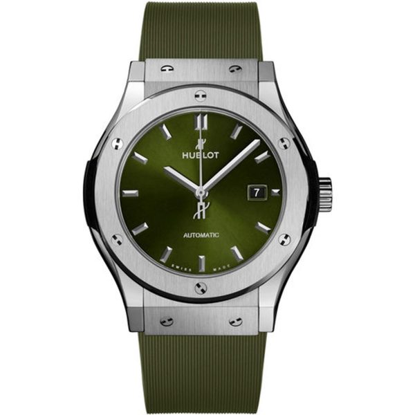 Il sofisticato orologio da uomo HUBLOT 542.NX.8970.RX della collezione Classic Fusion Titanium Green 42 mm incarna l’eleganza senza tempo del brand. Con una cassa in titanio leggera e resistente, il quadrante verde aggiunge un tocco distintivo a questo pezzo di alta orologeria. Il movimento automatico HUB1110 garantisce prestazioni impeccabili, mentre il cinturino in caucciù verde assicura comfort e durata. Con una resistenza all’acqua fino a 50 metri, questo orologio unisce design raffinato e prestazioni di alto livello per gli amanti dell’orologeria di lusso.
